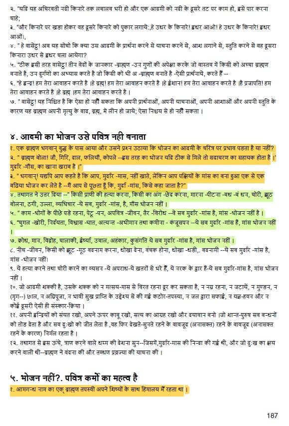 - एक ब्राह्मण ने भगवान बुद्ध के पास आकर कहा कि "यद्यपि आप कहते हैं कि आप मुर्दार मांस नहीं खाते, लेकिन आप पक्षियों के मांस का बना हुआ एक से एक बढ़िया भोजन कर लेते हैं"।